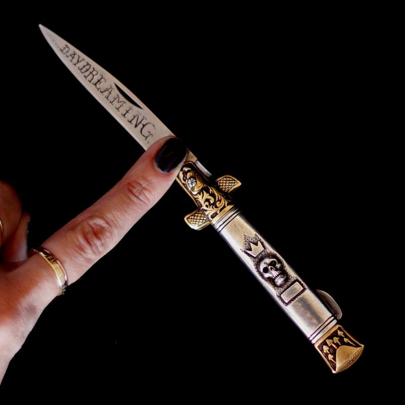Sterling silver, fold-out, hand-engraved front and back. Both sides etched with the Bard’s warning: One day you’ll be in the ditch, flies buzzin’ round your eyes. Carved brass accents frame the edge. A relic of mortality, rebellion, and the dream that cuts both ways.