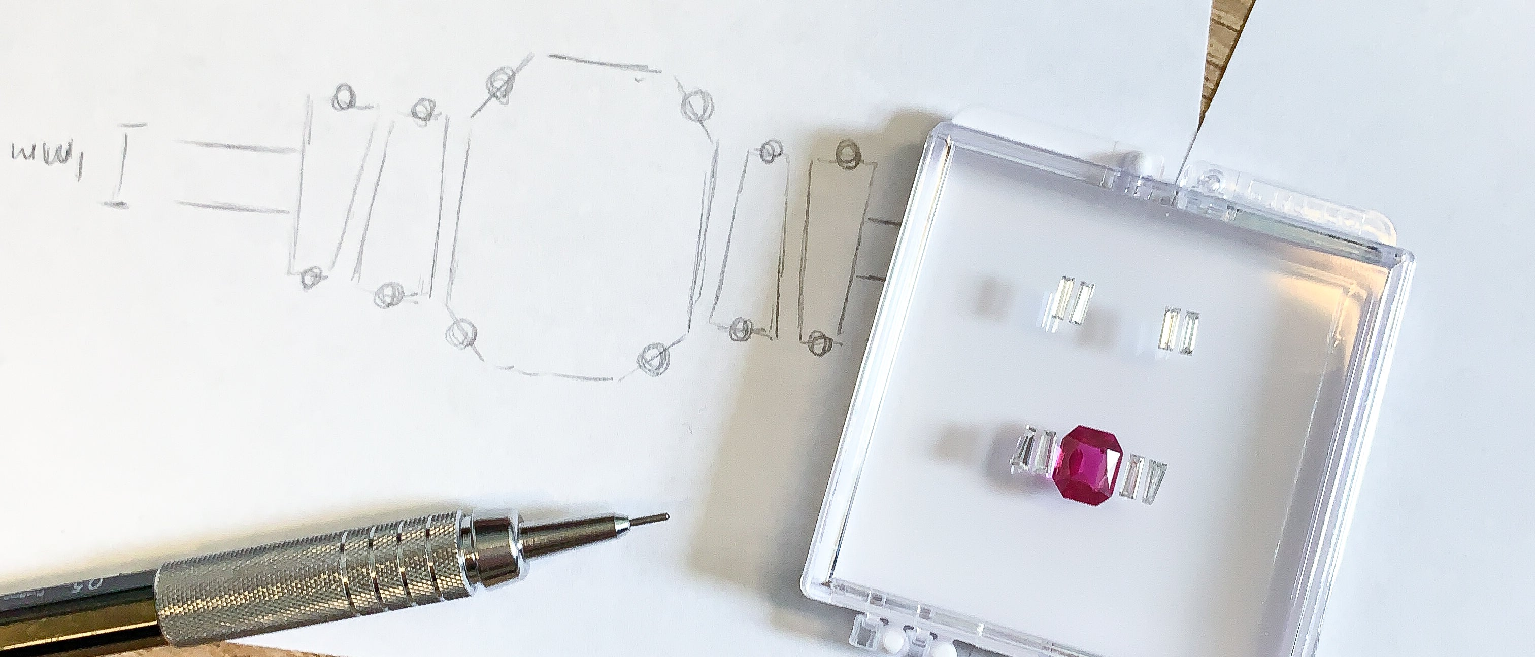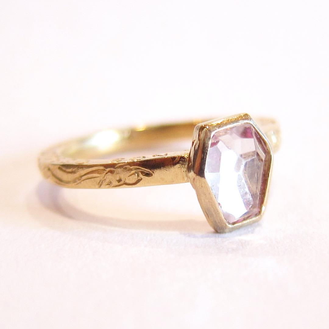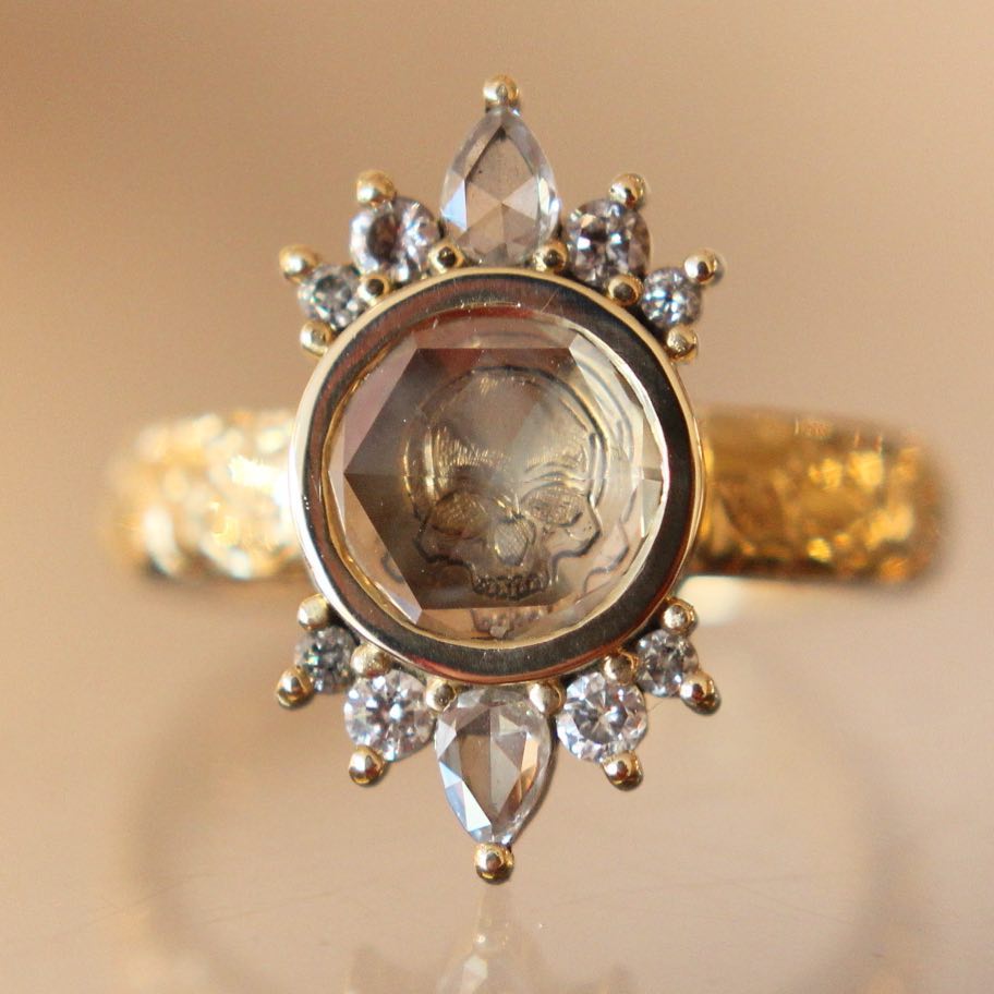 A custom coffin cut white sapphire in 18k yellow gold with a woman, a skeleton, and a devil — symbols for birth, death — the afterlife engraved into the band & ruby pavé underneath the sapphire.