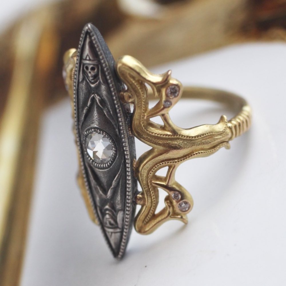 A funerary boat cradled by a ring-shank-as-uterus, forged in 18k gold and sterling silver. At its heart, a rose-cut diamond marks the passage of Pope Joan—Iones in life, Ioannes in death. A relic of transformation, concealment, and radical becoming.