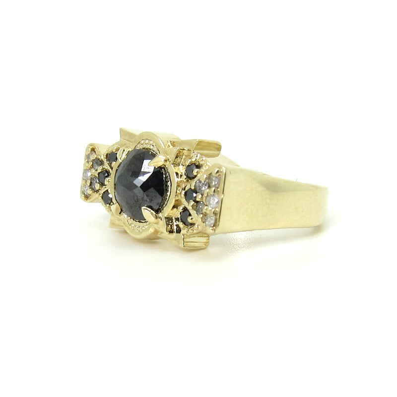 A black diamond burns at the center like a secret kept too long — set in clawed gold, it’s not asking to be understood.