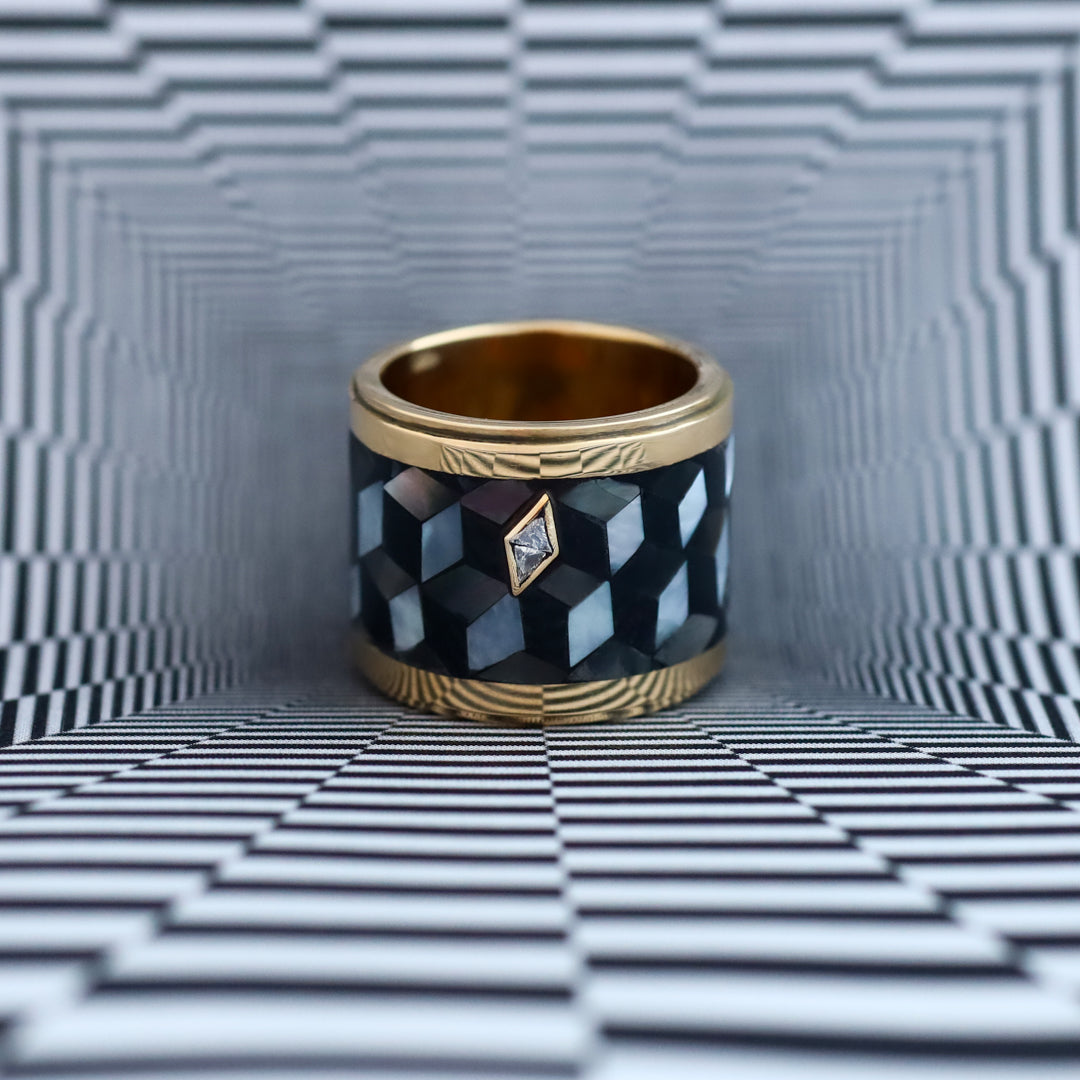 Do you see a hexagon or a cube? An exploration of the liminial space between geometry & the handmade. Meticulously hand cut black jade, mother of pearl & black pearl inlayed to form a seamless infinite geometrical optical illusion. Accented with bezel set two trillion white diamonds.