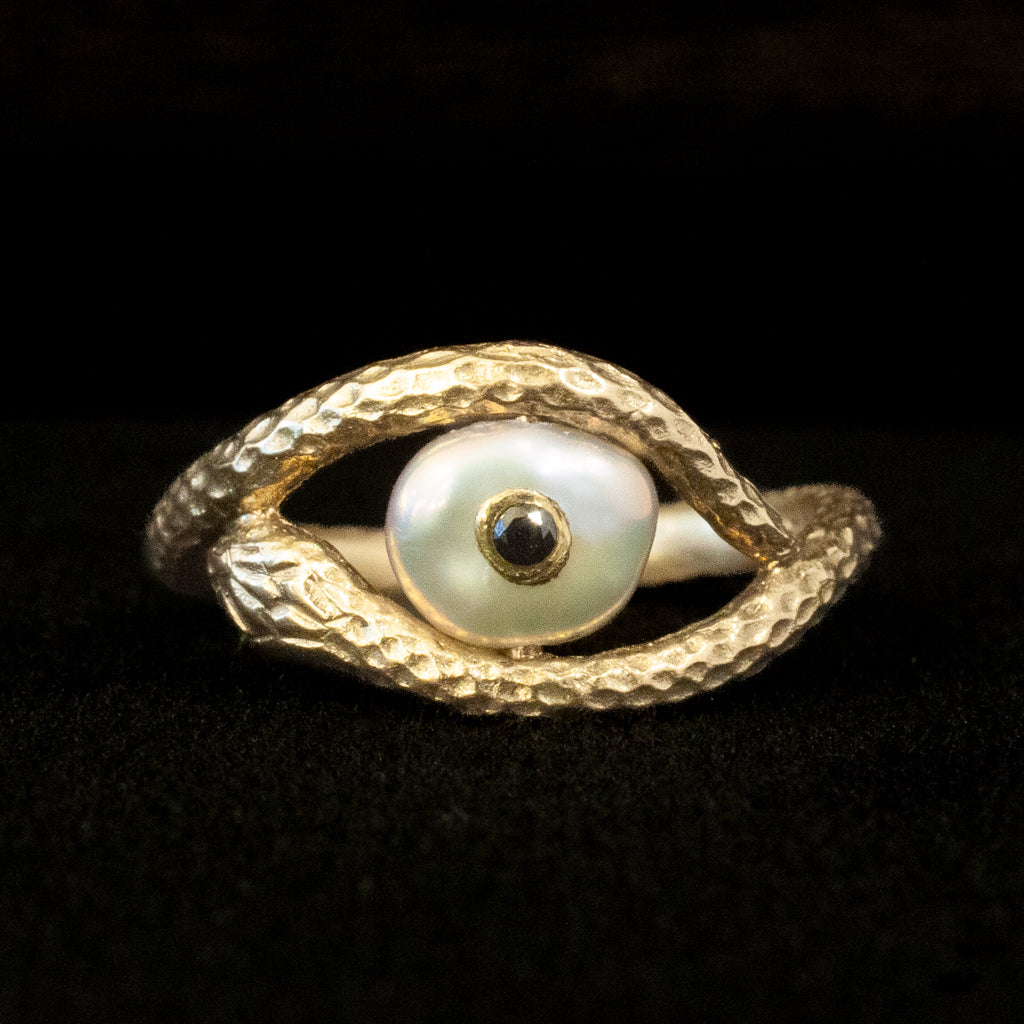 A lover’s eye, carved in keshi pearl and framed in yellow gold and black diamond, promises: I only have eyes for you. It rests snugly in the coils of a golden serpent, whose own white diamond eyes keep watch—protective, eternal, and just a little dangerous.